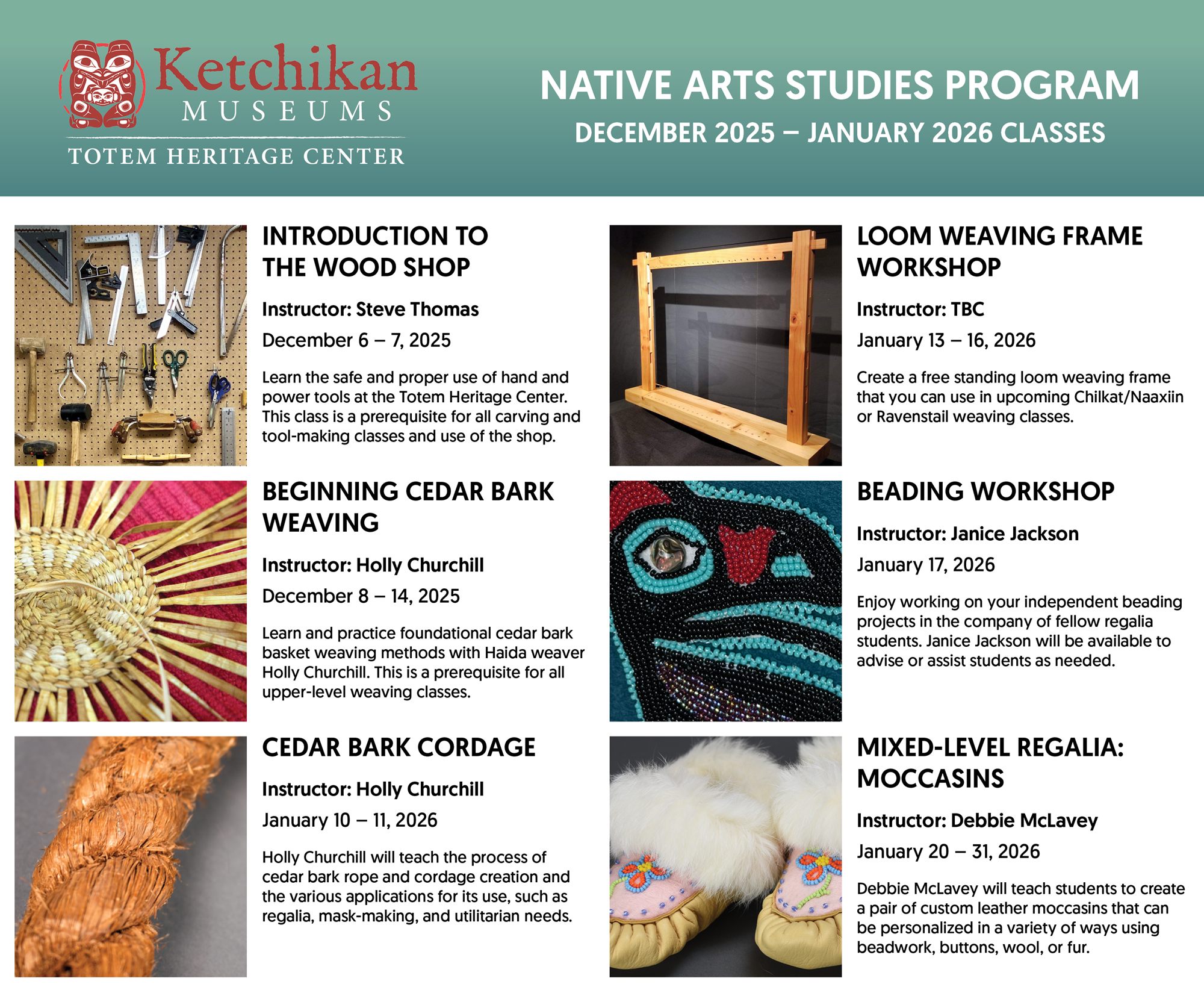 The Totem Heritage Center’s Native Arts Studies Program is dedicated to perpetuating Northwest Coast Native art and tradition. Classes are offered annually in weaving, basketry, design, carving, and regalia making.