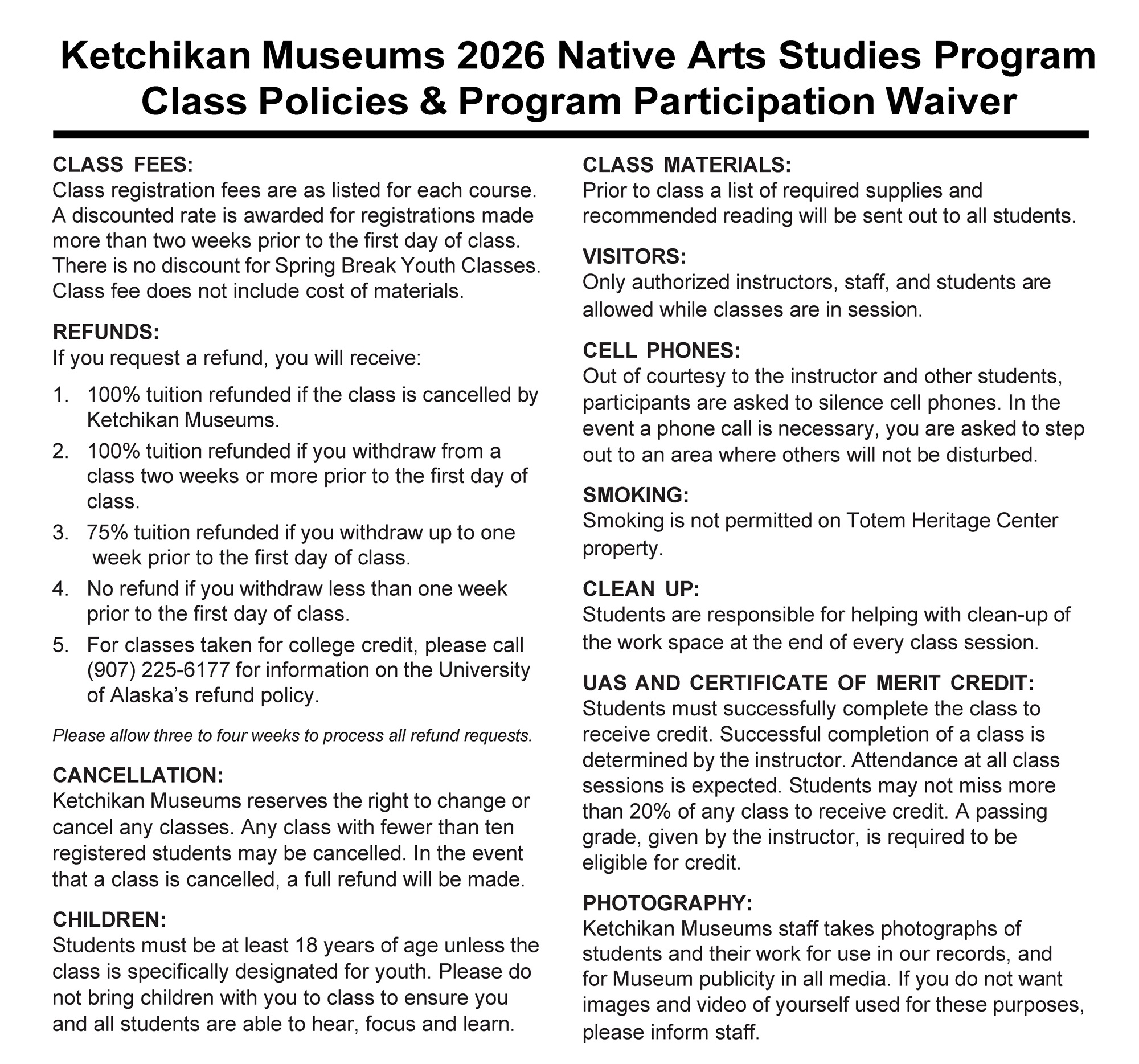 Native Arts Studies Program Class Policies & Program Participation Agreement.