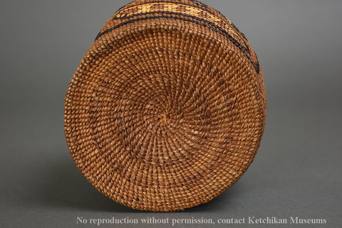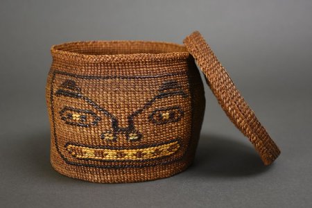Twined cedar bark basket and lid. Grass and maidenhair fern create the false embroidery design. The main design in the middle of the basket consists of two humanoid faces opposite of each other.