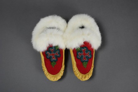 Adult moccasins with white rabbit fur trim and red felt insert with beaded blue flower design.