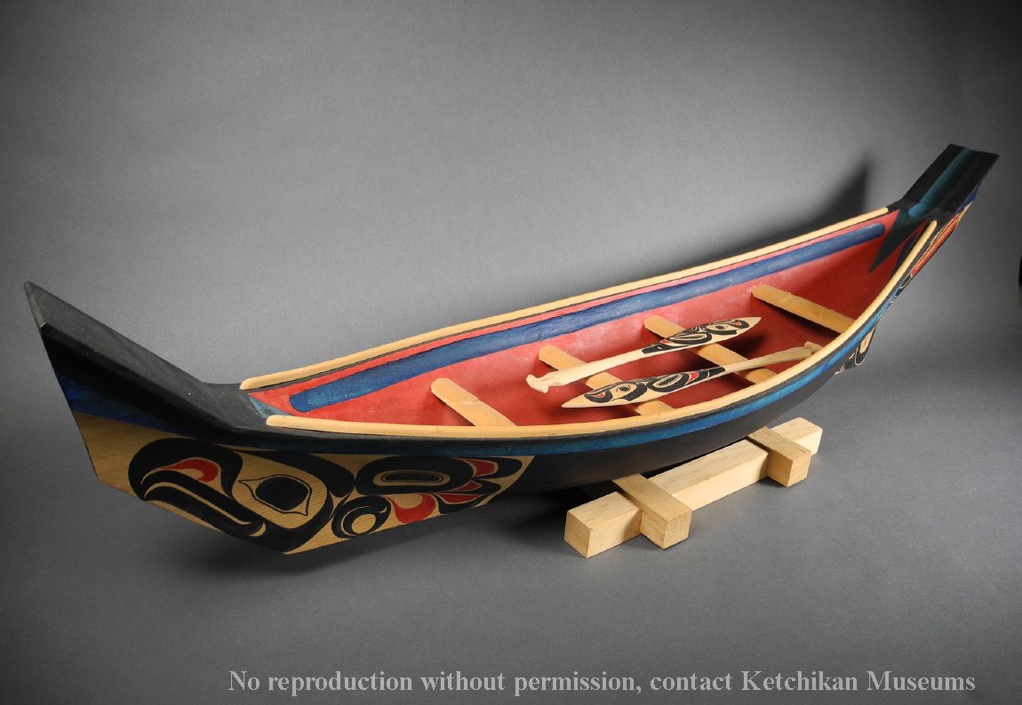 Carved steam-bent and painted Tlingit canoe model. In Southeast Alaska, communities are connected by water. Canoes are central to the lifeways and cultural identities of the Indigenous Peoples of the region. Large dugout cedar canoes are carved from a single red cedar tree and can be up to 70 feet (21.3 meters) long. Clan emblems often embellished the sides.