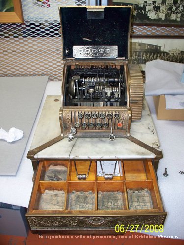 This model 52 1/4 National Brand Cash Register was created in 1907 for "Fujita Yamanoto & Kuramoto" of Ketchikan and was later used for many years at the Ohashi's store on Stedman Street. The 52 1/4 model was also known as the extended-base candy store register.