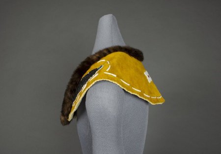 This collar is made of deer hide and trimmed in sea otter fur. There are two beaded black feathers on the front with dentalium shell outlines, three beaded flowers on the back, and abalone button attachments with a beaded rainbow clasp.