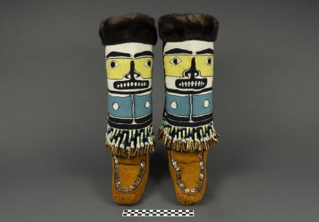 These moccasins are made of moose leather and seal skin, and trimmed with sea otter fur. The uppers are lined with abalone buttons. Copper cones are attached to the fringe along the bottom border of each Chilkat face to produce a distinctive sound as the wearer moves.