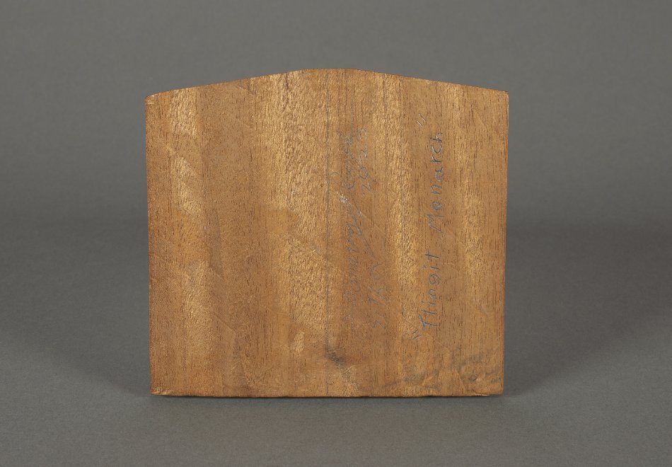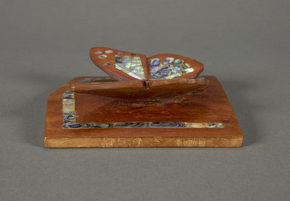 A frontlet was traditionally worn by high-ranking individuals for ceremonial occasions. The frontlet features the owner's house or clan crest carved in high relief, and is traditionally part of an elaborate headdress. This frontlet is made of mahogany and carved in the shape of a butterfly with abalone inlay. It was created when Naal xak'w, Tommy Joseph, taught the Mixed Level Carving - Frontlets class in 2023.