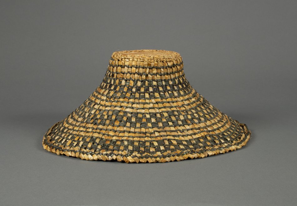 This plaited cedar bark hat is made with red and yellow cedar bark, and dyed red cedar. It is woven in the Tsimshian style. The plaited double warp hat has rows of basic Z-twist, three way twining, alternating colors with chasing, and a three way braided ending. This hat was created during the Intermediate/Advance - Cedar Bark Plaiting class taught by Mangyepsa Gyipaayg, Kandi McGilton, in 2023.