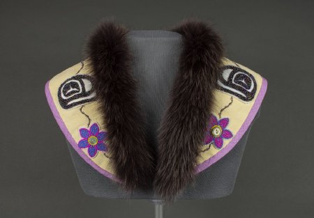 This collar is made with wool felt, leather, abalone buttons, seed beads, and is trimmed with dyed fox fur. It was created during the Mixed-Level Regalia - Beaded Hide Collars class taught by Aanchgwanutk, Janice L. Jackson, in 2022.