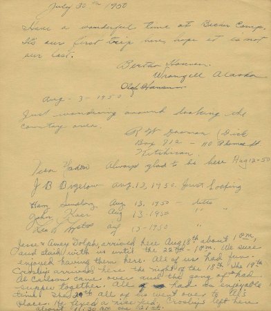 Mabel recorded every guest that stopped at camp with photographs and notes on what they ate for dinner and dessert. No visit was complete without guests signing their name in her guest book. This month's featured artifact is the family's guest book showcasing the years 1947 to 1954. Three other volumes of photo albums and scrapbooks document their hospitality and the companionship of guests that visited over the decades they operated their float camp.