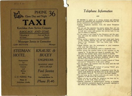 Ketchikan Museums maintains a robust collection of telephone books and city directories from 1910 to the present to help with research questions. Here are a few tips for deriving dating clues from old Ketchikan phone numbers. Up until the early 1950s, telephone numbers were listed by naming the exchange and the two or three digits for each connection. For example, when the Gilmore Hotel opened in 1927 its telephone number was listed as 470. In 1954, telephone numbers became four digits. That year, the Gilmore Hotel's number was 2174. The change was short-lived and in 1959, a new seven digit number system was introduced including a prefix that was frequently dropped when dialing a number. The Gilmore Hotel's number converted to CA5-2174. By 1968, following national trends, Ketchikan Public Utilities eliminated the exchange prefix and developed the standard seven digit numbering system that we still use today.
