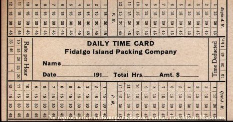 Little is known about the vast majority of cannery workers. This employee timecard dates to the 1910s and provides a humanizing element to the grueling work they faced season after season. The Washington-based Fidalgo Island Packing Company (FIP) established its Ketchikan plant in 1900. Like most canneries at the time, the facility here started packing fish by hand, using both Native and foreign labor. By 1919, FIP employed 205 workers.