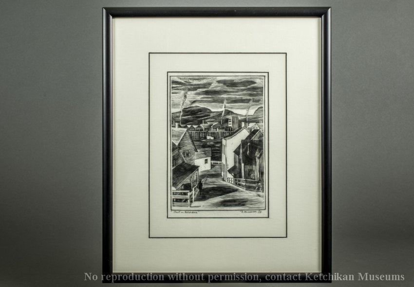 Weathered wooden boardwalks, a tide low in the harbor, and smoke rising from waterfront buildings fill Roland Mousseau's, "Street in Ketchikan." The woodblock-style print captures a unique downtown view that feels both familiar and distant, preserving a moment in the city's past. Mousseau created the piece while on assignment for a Works Progress Administration (WPA) art project that sent twelve artists north to document life in the territory in 1937. The project launched in Ketchikan, with artists arriving in June aboard the steamship North Sea. Upon arrival the artists split into smaller groups of three. Over the next several months the groups were dispatched around the state to Wrangell, Valdez, Seward, Anchorage, Mt. McKinley Park (known today as Denali), and Fairbanks. Although they traveled on similar routes, each group spent varying amounts of time in each location. Each artist created a distinctive portrayal of the locations they visited, finding inspiration from a variety of sources. While in the Ketchikan area, the artists observed various industries, explored town and local trails, and used a Forest Service ranger boat to access the backcountry. One group reportedly stayed at an abandoned cabin in Carroll Inlet.